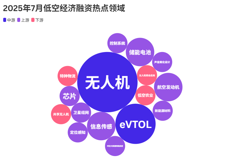2025年7月,低空经济融资热点范畴图谱清晰脉络。无人机取eVTOL(电动垂曲起降飞翔器)成为焦点聚核心,凸显其正在低空经济生态中的环节地位。环绕无人机,上逛笼盖芯片、节制系统、储能电池等根本手艺取部件,下逛延长至特种物流、共享无人机、低空农业等使用场景,构成“手艺-系统-场景”全链条结构。eVTOL联系关系航空策动机、新能源材料、时空大数据智能底座等环节,取无人机协同,建立起低空经济焦点财产矩阵。如声音美化设想提高eVTOL乘坐舒服度、无人机分析使用拓展营业鸿沟,表现手艺立异取场景落地的深度融合。此款式反映本钱对低空经济全财产链价值的挖掘,从底层手艺冲破到终端场景使用,上下逛协同共进,将加快低空经济财产化历程,鞭策行业从概念更广漠的现实使用空间。