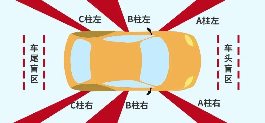 A、B、C柱盲区:轿车一般都有三个立柱,前挡风玻璃两侧的斜柱叫A柱,前后门两头的立柱叫B柱,后挡风玻璃两侧的斜柱叫C柱,这三个柱子是用来防止汽车碰撞变形的,但也形成了司机视野的遮挡,从而构成盲区。特别是A柱盲区每当汽车转弯或进入弯道前,驾驶者的视野城市被A柱部门遮挡,出格是大型车辆的盲区会更大一些。