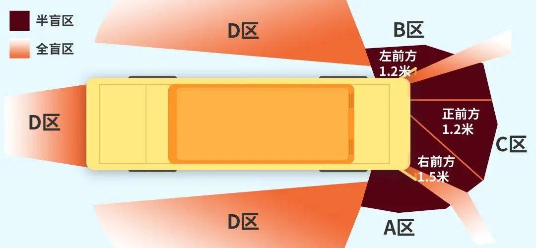 D区全盲区:D盲区处于司机间接的视线范畴以及三块后视镜的视线范畴外。